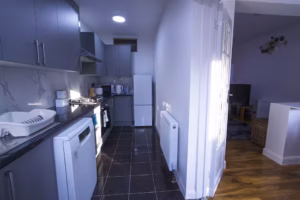the stylish and modern living area consists of 1 sofa, can sleep 1 person if absolutely necessary. Duvet and pillow is stored inside the sofa. The room also contains a 50” Smart TV and free super fast Wi-Fi.